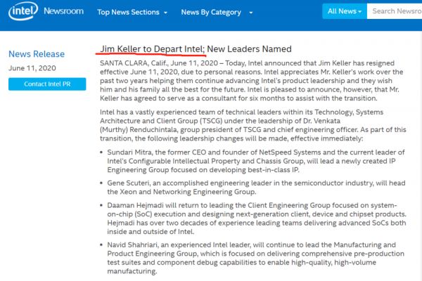 虽然英特尔官网只是含糊地将凯勒离职理由总结为“个人原因”,但公司随之向外界公布,英特尔首席工程师Murthy Renduchintala领导的技术、系统架构和客户部门(TSCG)将提拔四名工程师担任更高职务。