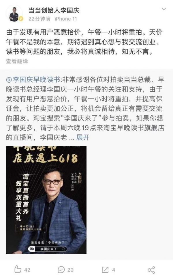 果然,随后李国庆在微博上发布信息称,发现有用户恶意抬价,午餐一小时将重新拍卖。