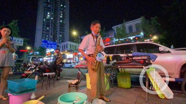 2020年6月1日,据上游新闻·重庆晨报报道,疫情后,重庆78岁老人段成军在两江新区康庄美地附近的美食一条街外,练摊的同时演奏音乐的故事。老段练摊10年,只要晴天,从不间断,既卖乐器,又卖金鱼和乌龟。手中一把二胡,旁边老伴作陪。