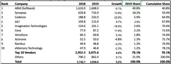 据IPnest数据显示,2019年,ARM、Synopsys、Cadence在全球范围内分别拥有40.8%、18.2%、5.9%的市场份额(按营收计算),其中Synopsys(新思科技)、Cadence(铿腾电子)两家美国公司拥有的市场份额合计为24.1%,这表明英国和美国在半导体IP授权领域处于绝对领先的地位。