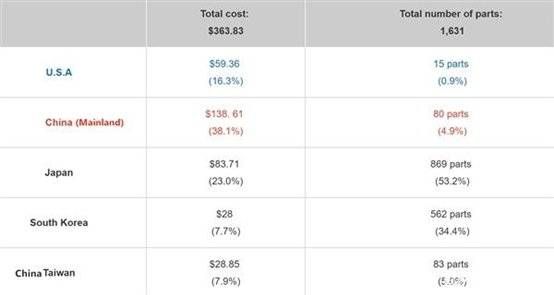 反之日本虽然零部件数量有869个,占了53.2%,但其实大部分是价格很低的被动元件,因此总金额占比为23%。