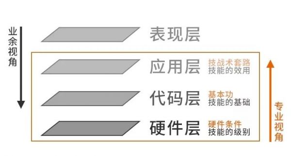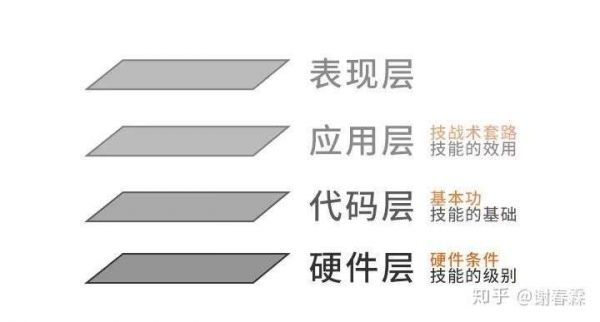 训练的方法要有针对性,你可以通过技能分层图来寻找,从下往上分为四个层次:硬件层、代码层、应用层和表现层,下层的能力越夯实,技能的整体表现就越出色。