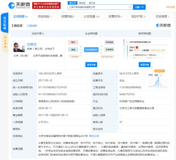 北京千跃网络科技有限公司成立于2017年9月,法定代表人为沈琳杰,公司经营范围包括从事互联网文化活动;经营电信业务;技术开发、技术转让、技术咨询、技术服务、技术推广;基础软件服务;应用软件服务等。