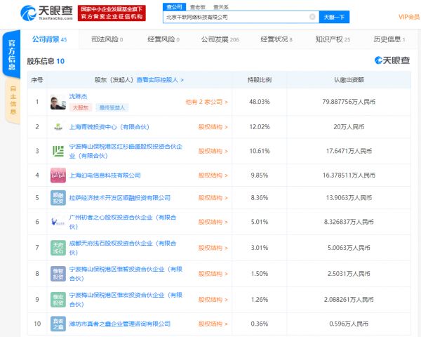 天眼查数据显示,该公司工商披露的股东中,沈琳杰本人为该公司最大股东,持股比例为48.03%,上海幻电信息科技有限公司为该公司第四大股东,持股比例为9.85%,除此之外,公司股东还包括红杉资本中国、青锐创投、初心资本等。