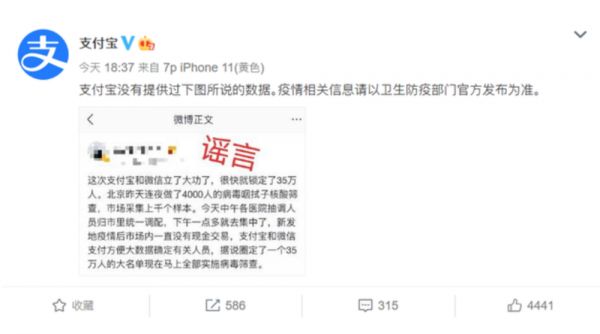 @新浪科技【支付宝微信否认提供数据锁定新发地35万人:谣言】 6月14日晚间消息,网传北京新发地出现新疫情之后,支付宝和微信通过提供交易数据,帮助防疫部门,锁定35万途经新发地的人员。