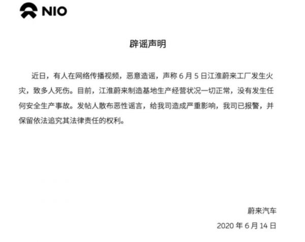 蔚来辟谣火灾传言