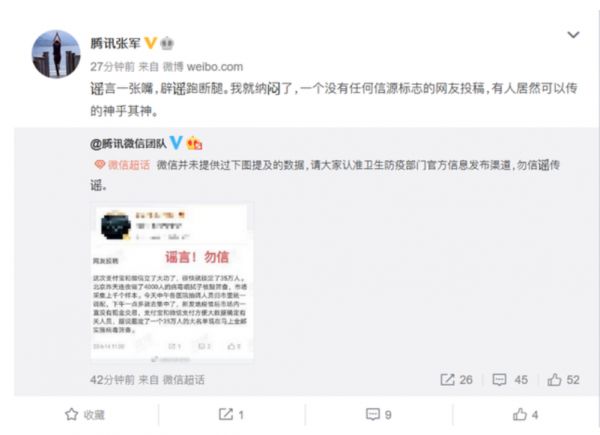 腾讯公司公关总监张军称,“谣言一张嘴,辟谣跑断腿。我就纳闷了,一个没有任何信源标志的网友投稿,有人居然可以传的神乎其神。 ”