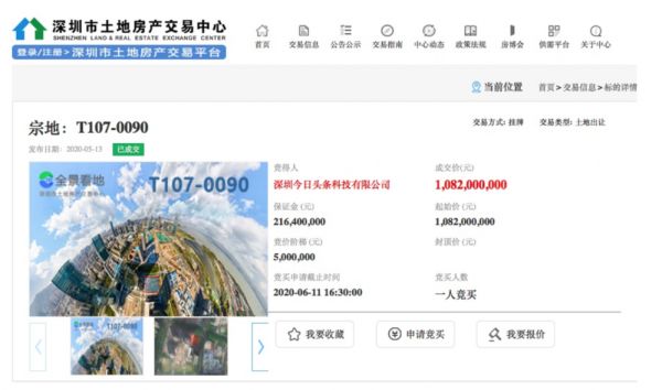 据悉,上述土地面积 4091.88 平米,土地使用年限 30 年,起拍价 10.82 亿元,楼面价约为每平方米 1.73 万元,竞买保证金需要 2.614 亿元。最终,深圳今日头条科技有限公司以底价 10.82 亿元将这块地收入囊中。
