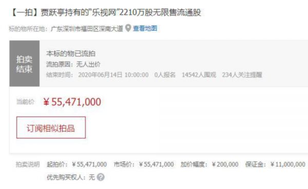 @新浪科技【贾跃亭所持“乐视网”股权拍卖无人报名】 6月14日上午消息,据京东拍卖官网显示,贾跃亭持有的2210万股“乐视网”无限售流通股昨日10时开拍,起拍价为5547.1万元,截至拍卖结束仍未有报名者。