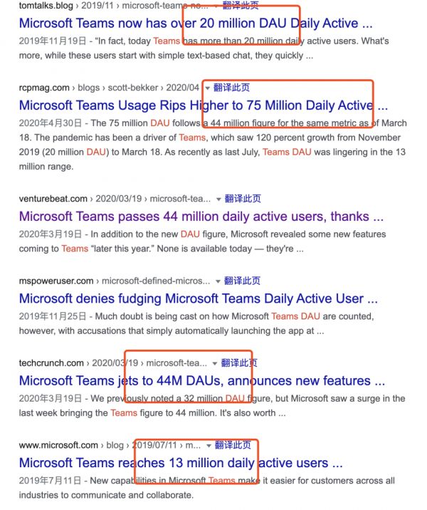如果你现在去Google搜索 "Teams + DAU",画风大概是这样的: