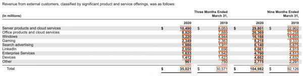 我们看一下微软第一季度的财报,已经把业务和收入分类,区分开了: