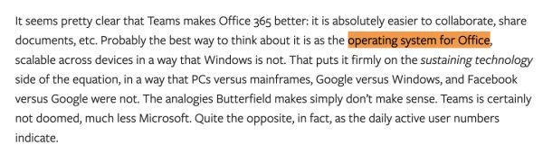 Office的操作系统不是Windows,而是Teams这款产品本身,因为Windows解决不了跨设备、跨终端的数字化弹性需求(Scalability)问题,但Teams却天然解决了。