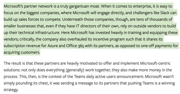 这些点直接导致了,每当市面上有各种客户的数字化需求的时候,vendor们会死心塌地的部署微软生态的解决方案(Microsoft-centric solutions),而不是围绕Slack以及刚刚搭上讪的亚马逊去构建...