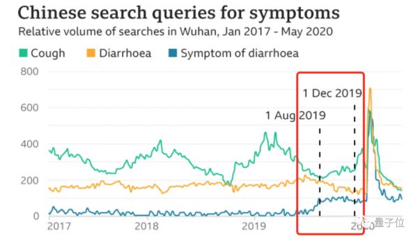 然后,研究人员就在百度上搜索了一些与新冠病毒症状相关的词语,发现尤其是「腹泻」这个词,搜索量有所增加。