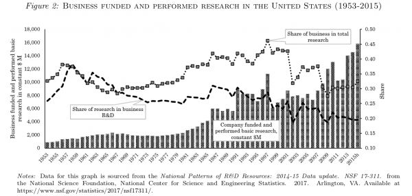 贝尔实验室已于1996年从其母公司AT&T分离出来,归入朗讯公司旗下;施乐PARC也于2002年分拆成一家独立的公司。其他企业实验室也被裁减了规模。在90年代中期,Louis Gerstner领导下的IBM公司将研究方向调整为更面向商业应用。最近的一个例子是杜邦公司在2016年关闭了其中央研发实验室。成立于1903年的杜邦公司的研究曾经可以与顶级大学化学系的研究相媲美。在20世纪60年代,杜邦的中央研发部门在美国化学会杂志上发表的论文,比麻省理工学院和加州理工学院加在一起还要多。然而到了20世纪90年代,杜邦公司对科研的态度发生了变化,在科学论文发表量逐渐减少后,公司管理层于2016年关闭了中央研发实验室。