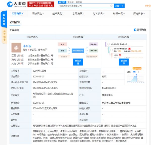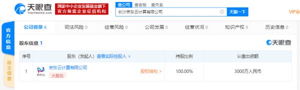 网易科技讯 6月16日消息,天眼查数据显示,近日,长沙京东云计算有限公司成立,该公司注册资本3000万人民币,法定代表人为李永明,公司经营范围包括大数据处理技术的研究、开发;信息安全等级保护咨询;物联网技术服务;信息科技技术、软件的开发;信息科技技术转让;信息科技技术咨询等,由京东云计算有限公司全资持股,后者的最大股东为刘强东。