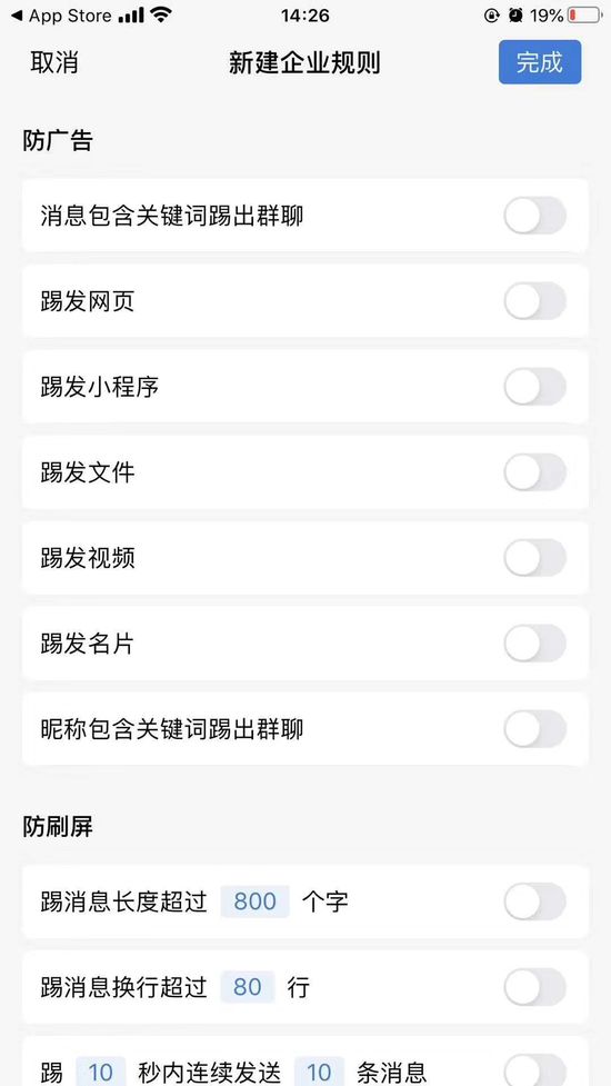 据悉,用户可以在企业微信群新建企业规则,包括“防广告”、“防刷屏”等模块。在“防广告”板块中,用户可以设置消息或者昵称包含关键词时踢出群聊,同时可以选择踢出发送网页、小程序、文件、视频、名片等内容的群成员。在“防刷屏”板块,用户可以选择踢出频繁发送消息或者发送大篇幅内容的群成员,具体标准可手动设置。