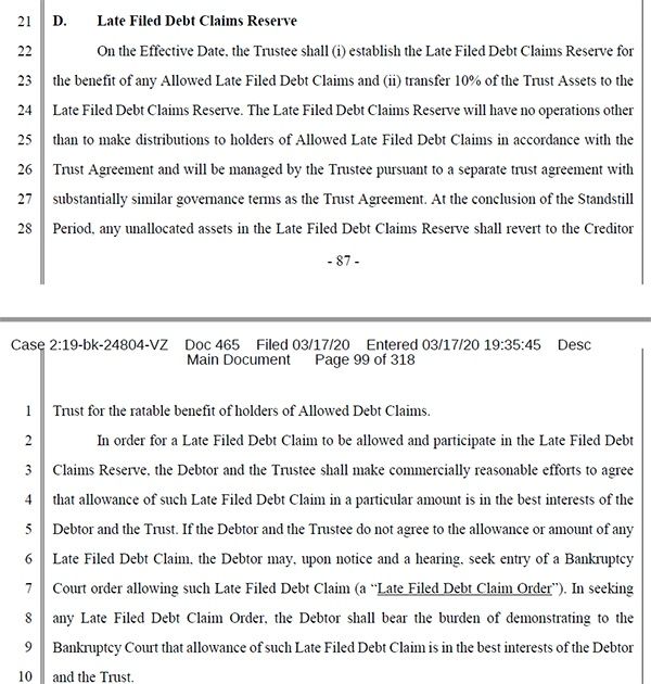 在生效日当天,建立逾期提交索赔池来解决任何逾期提交的索赔主张,以及把10%的信托资产转至逾期提交索赔池。逾期提交索赔池不开展经营活动,只按照信托协议向获准逾期提交索赔持有人进行分配,并由受托人按照条款基本与信托协议管辖条款相似的单独信托协议管理。停滞期结束时,逾期提交索赔池内未分配的任何资产应归还债权人信托,获准索赔持有人应享有相应比例的权益。