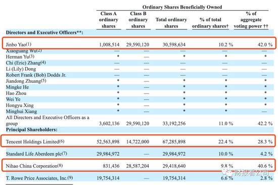 在58同城2019年年报中,我们看到,姚劲波和腾讯是其两大股东。姚劲波目前持有10.2%的普通股,以及42.0%的投票权;腾讯持有22.4%的普通股,以及28.3%的投票权。