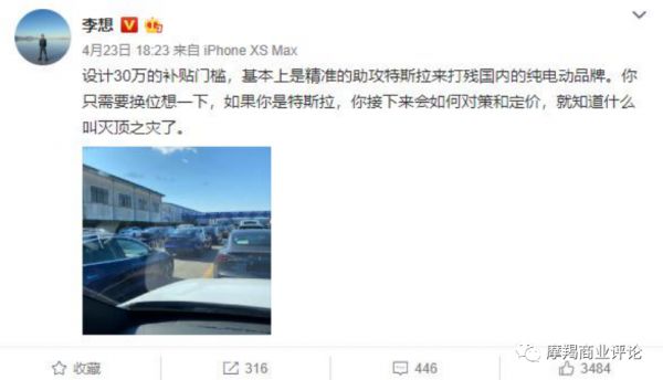在4月份的新能源车补贴新政出台之后,李想曾在微博上发过一句牢骚: