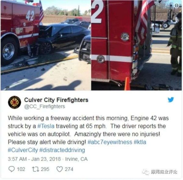 2018年1月26日,在洛杉矶405高速公路上,一辆特斯拉Model S电动汽车追尾了路边停放的消防车。司机告诉消防部门,当时汽车处于Autopilot自动驾驶模式。