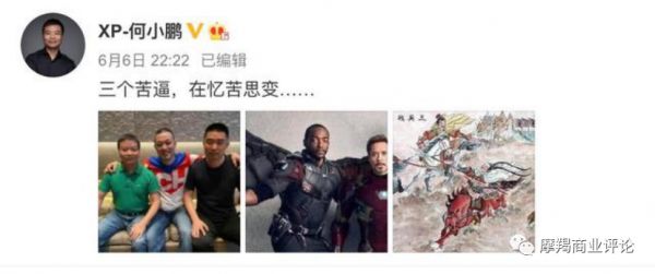 6月6日,小鹏汽车 CEO 何小鹏发布了一条微博:三个苦逼,在忆苦思变 ...... 他配了三张图片。第一张是何小鹏与蔚来汽车 CEO 李斌、理想汽车 CEO 李想的合照;第二张是漫威三大英雄的合影;第三张就是三英战吕布的漫画。