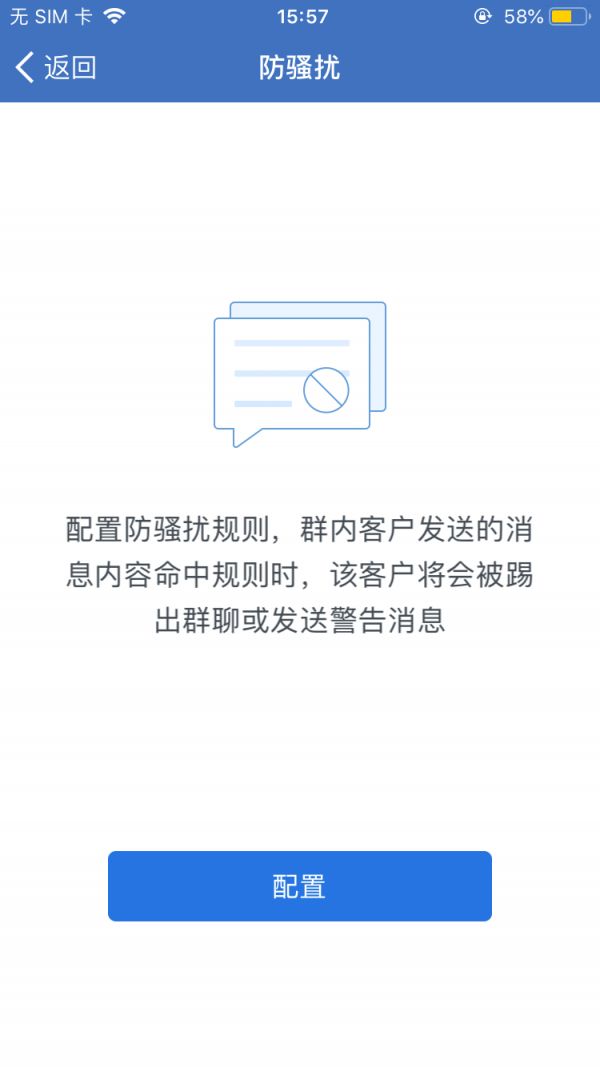 成员设置防骚扰规则,在客户群开启防骚扰后,当群客户触发规则,比如在群内发广告、刷屏时,将会被自动移出群聊或被警告;