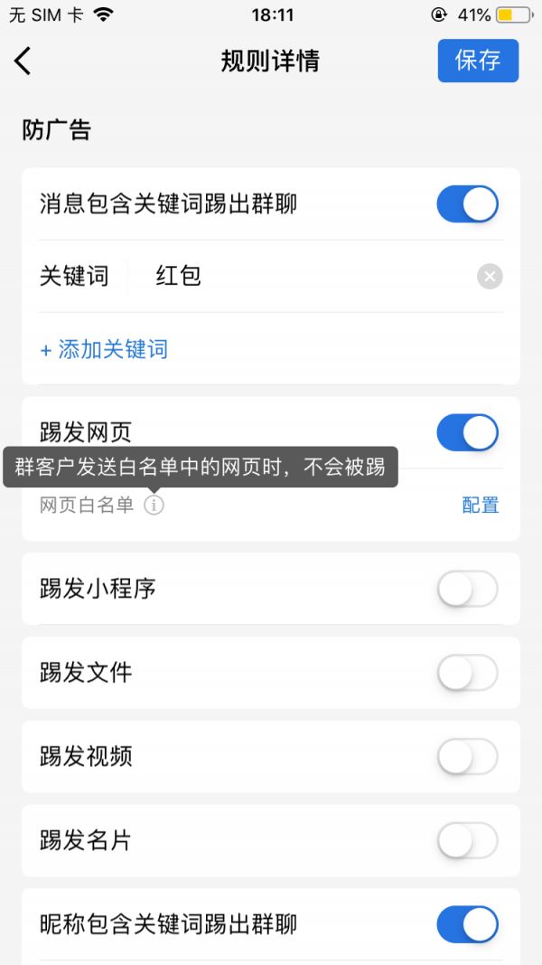 防广告功能非常丰富,无论是发网页、发小程序、发文件、发视频、发名片,还是消息包含关键词,甚至昵称包含关键词,一旦群成员触发原先设定好的规则,都会被移除或警告!