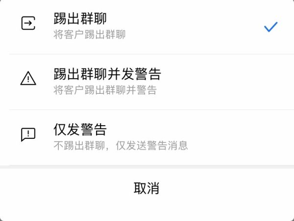 ③仅发警告:开启后,触犯规则不会将客户踢出群聊,仅发送警告消息