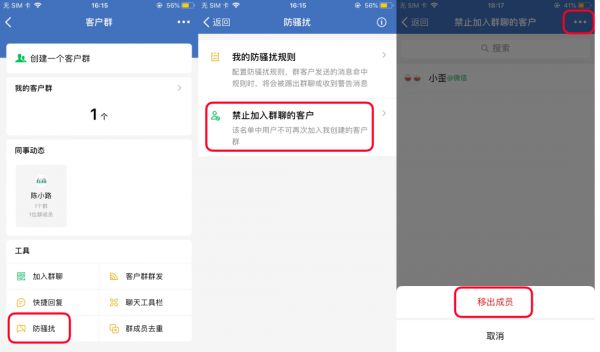 移除后还可将客户设为禁止入群(拉黑),此操作会将该成员从所有客户群移出且不能再加入该成员的所有客户群。