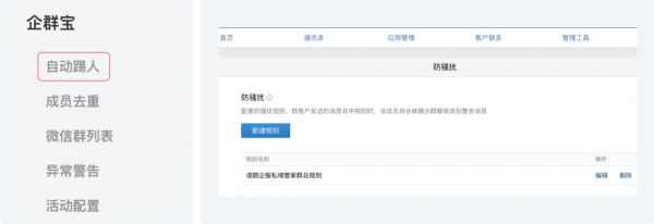 怎么操作呢?登陆私域管家管理后台,点击企群宝模块-自动踢人,新建防骚扰规则即可。
