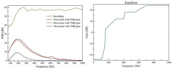 下图显示了从每个望远镜获得的光学测量结果,和从麦克风的声学测量结果中获得的SNR。根据获得的结果,研究人员还创建了一个均衡器(equalizer)。