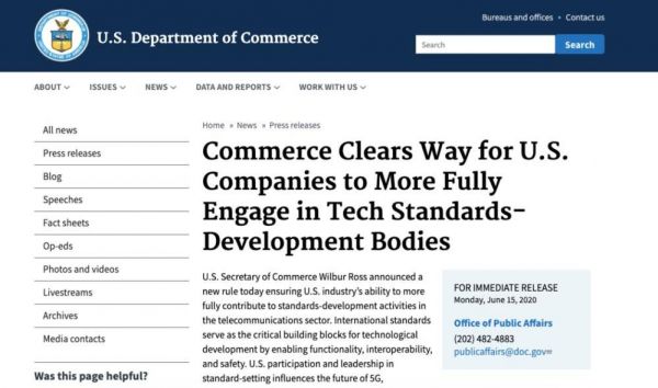 当地时间6月15日,美国商务部发布公告称,为了实现通信产业之间的功能化、兼容性和安全性,美国必须参与到通信领域的标准制定中,作出自己应有的贡献,从参与并引领着5G、自动驾驶、人工智能和其他未来尖端技术在全球的发展。