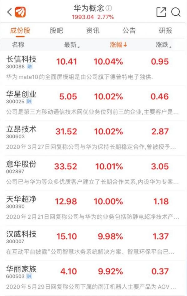 A股方面,截至16日收盘,华为概念指数整体上涨逾2.7%。其中,长信科技、华星创业、立昂技术、意华股份、天华超净、汉威科技、华丽家族等成分股纷纷涨停。