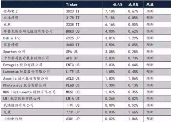 据彭博社搜集的数据显示,ASML的光刻机也使用了美国的技术,而从ASML整个上游供应链看,ASML的17家核心供应商中,竟然有9家来自美国,包括布鲁克斯自动化,sparton,II-VI Incorporated公司、Lumentum(鲁门特姆控股公司)等,此外ASML光刻机的光源由Cymer(已被ASML收购)提供,计量技术装备由美国惠普制造。由于ASML光刻机大部分零部件选择外包,因此对供应商,尤其是美国供应商依赖程度严重。