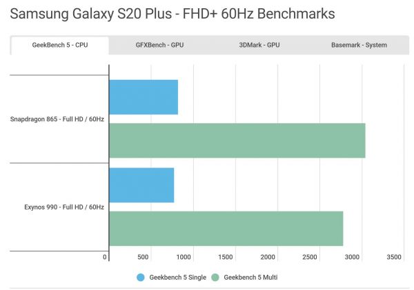 例如在 FHD+ 分辨率、刷新率为 60Hz 的配置下,无论是单核还是多核,骁龙 865 在 CPU 方面的成绩都优于 Exynos 990;GPU 方面,Exynos 990 落后骁龙 865 近 50%;系统性能方面,骁龙 865 也更胜一筹。