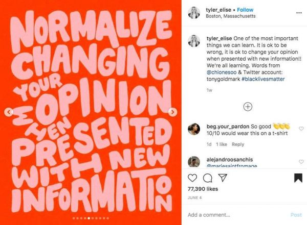 用来分享图片的社交媒体Instagram变成了一个大型反歧视教育集结地。大量的教育帖出现在信息流中,解释什么是系统性和个人性的种族歧视。书店的帐号放出了各种关于美国种族问题、非裔作家写作的书籍。有人把Netflix上讨论非裔经历的纪录片和电影集结在一起,制作成“必看片单”。与此同时,“如何与不相信问题存在的家长进行对话”以及“如何在白人社区中开展种族议题对话”也变成了大热话题,被Instagram上的独立创作者制成了卡通教育帖。