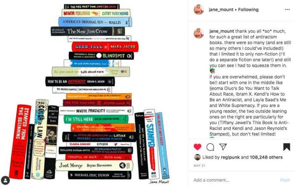 艾琳是我在学校剧团的一个朋友,家住在纽约州北部。一次刷Instagram的时候,艾琳发现了一张关于种族问题的书单,并转发到了自己的快拍上。看到帖子的朋友们纷纷来问她,这是不是一个群读书活动。