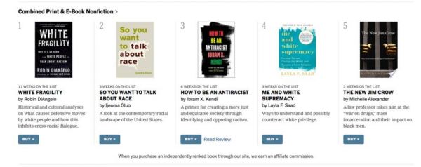 艾琳的阅读小组并不是唯一对这个话题感兴趣的人群,寻找关于种族议题的书籍已经在全国各地成为热潮。各个独立书店纷纷列出了自己的推荐书单,媒体也开始选择相关书目进行介绍。在《纽约时报》每周一评的畅销书单里,《White Fragility》和《So You Want To Talk About Race》两部经典作品占据了非虚构文学的榜首。