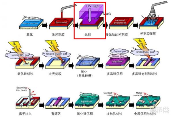 我们不妨先理解“光刻”这项技术的重要性。如果把芯片比作刻版画。芯片生产的过程就是在硅衬底这张“纸”上,先涂上一层名为光刻胶的“油墨”,再用光线作“笔”,在硅衬底上“拓”出需要的图案,然后用化学物质做“刻刀”,把图案雕刻出来。