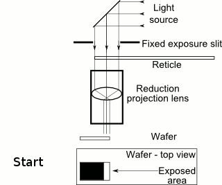 步进式扫描光刻技术的原理是,光线透过掩膜板上的狭缝照射,晶圆与掩膜板相对移动。完成当前扫描后,晶圆由工作台承载,步进至下一步扫描位置,进行重复曝光。整个过程经过重复步进、多次扫描曝光。