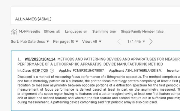另外,在专利网站Patentscope上的搜索结果显示,阿斯麦申请的专利数目已经达到14444项。阿斯麦虽然是一家商业公司,但支撑它走得更远的,不是对金钱的追求,而是对技术的长远投资。