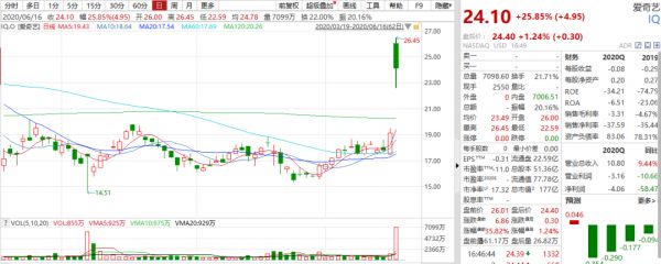消息一出,爱奇艺应声大涨,涨幅一度超过40%。截至美股6月16日收盘,爱奇艺涨幅锁定在25.85%。