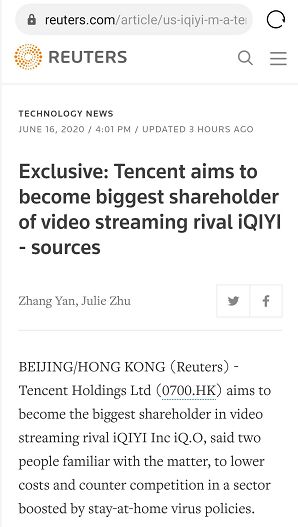 6月16日北京时间下午4:01,路透社新闻版首先独家爆料称,腾讯(0700.HK)有意向收购百度(NASDAQ:BIDU)持有的爱奇艺(NASDAQ:IQ)股份,成为爱奇艺的最大股东。