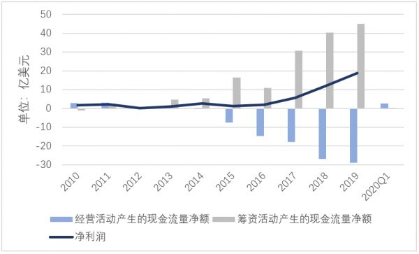 ▲奈飞从2015年开始加大筹资力度,2015-2019年利润快速上升的同时,其自身经营活动产生的现金流量始终为负,且经营产生的现金缺口不断扩大
