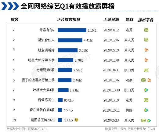 ▲2020年一季度播放量排名前十的网络综艺,只有3、4、6不是腾爱独播