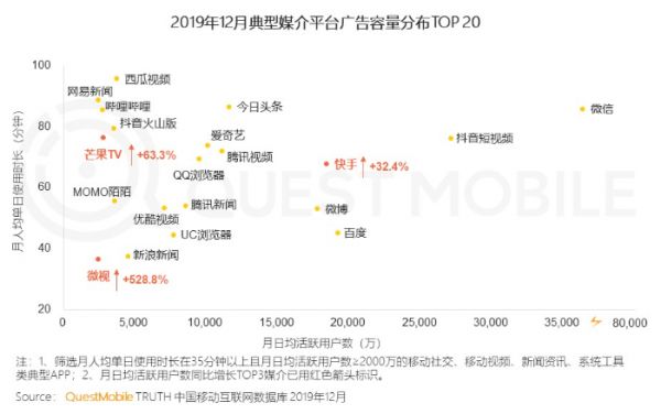 Quest Mobile数据显示, 2019年抖音短视频DAU(日均活跃用户)远超除微信外的其他头部APP,抖音短视频和抖音火山版的月人均单日使用时长也都位居前列。西瓜视频更是有些出人意料地在使用时长方面拔得头筹。