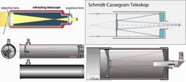 左上:反射式光路 左下:牛顿式光路 右上:施密特-卡塞格林式 右下:马克苏托夫-卡塞格林式(图片来源:新浪网)