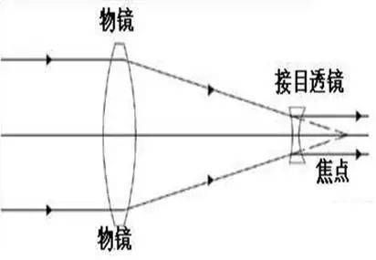 伽利略望远镜问世后不久后的1611年,德国科学家开普勒发明了物镜和目镜均采用凸透镜的另一种折射式望远镜。这种望远镜目镜在物镜焦点之后,可以放置十字丝。由于不同的光在介质中有着不同的折射率,折射望远镜不可避免的存在色差。