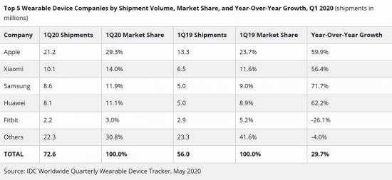 IDC数据显示,2020年Q1全球可穿戴设备销量7260万台 同比增长29.7%。其中苹果、小米和三星分别以23.7%、11.6%和9.0%的比例占据前三的市场份额,在前三甲中苹果和三星以智能手表为主,唯有小米依靠智能手环超过华为和Fitbit占据第二的市场份额。小米长期走低定价薄利多销大众化的路线,这是小米能够登上榜二的主要原因。